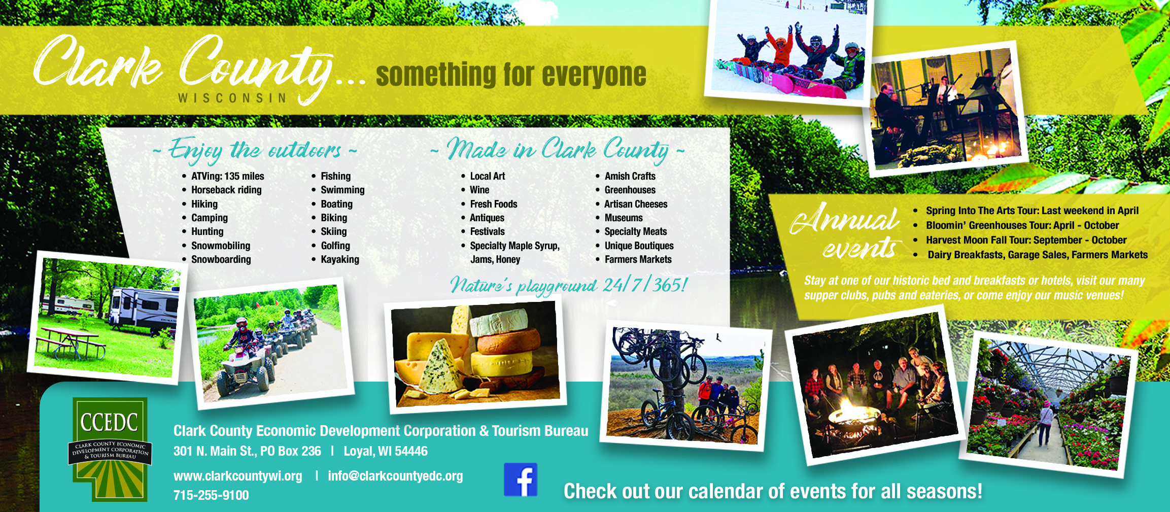 Come explore Clark County! Experience our Midwest charm, unique communities, and diverse business mix. Partake in our “24/7” outdoor recreational area’s, shops, galleries, restaurants, festivals, lodging, golf courses and more. We invite you to enjoy our quality of life for a day or a lifetime!